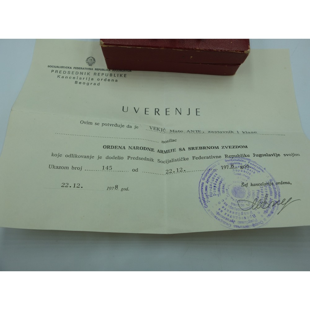 Jugosławia Order Armii Ludowej 3 kl. + pudełko i dokument