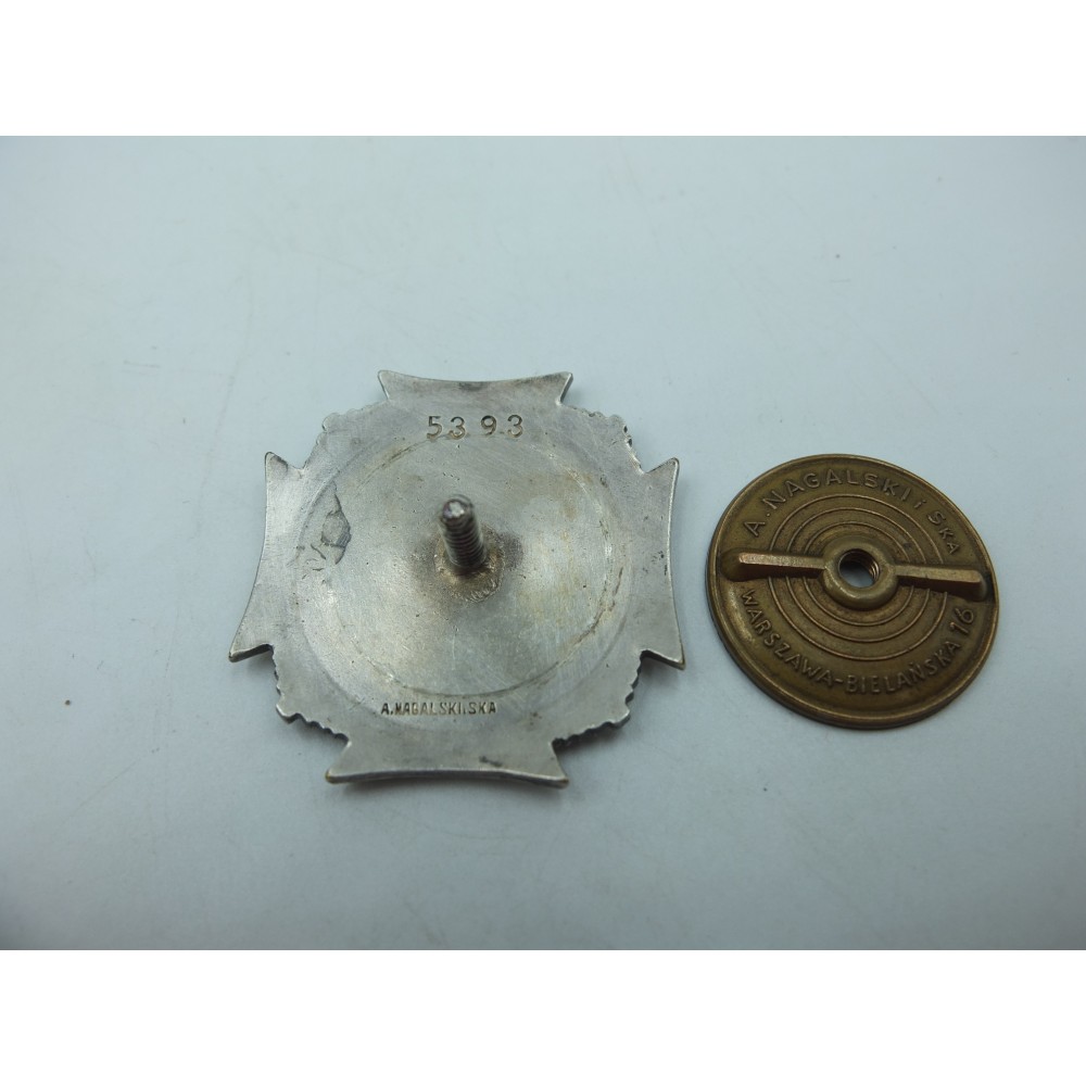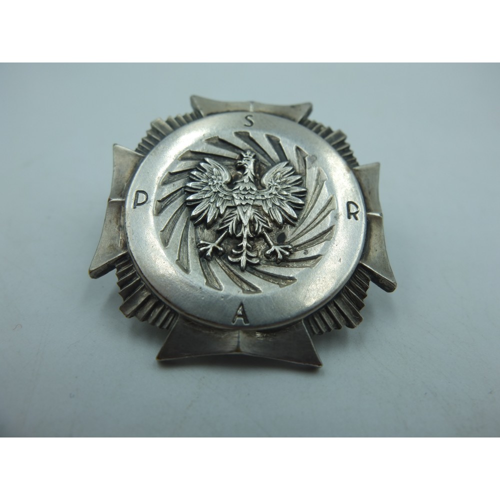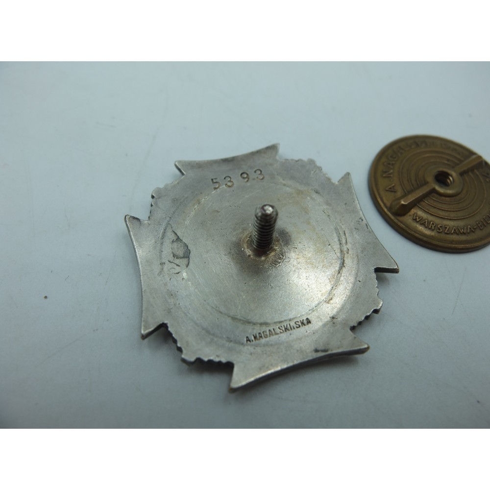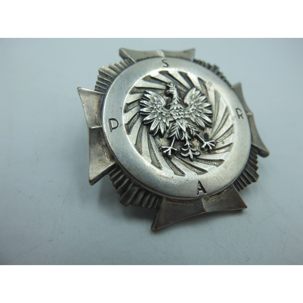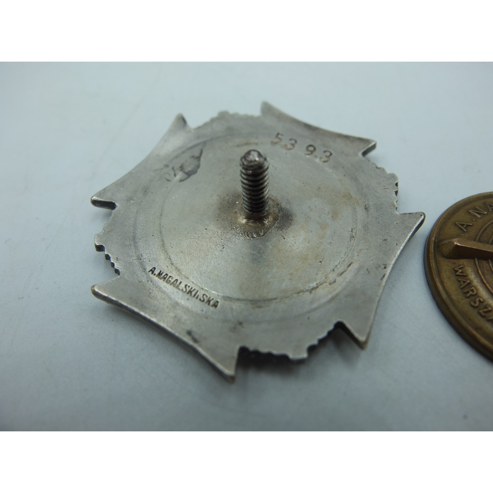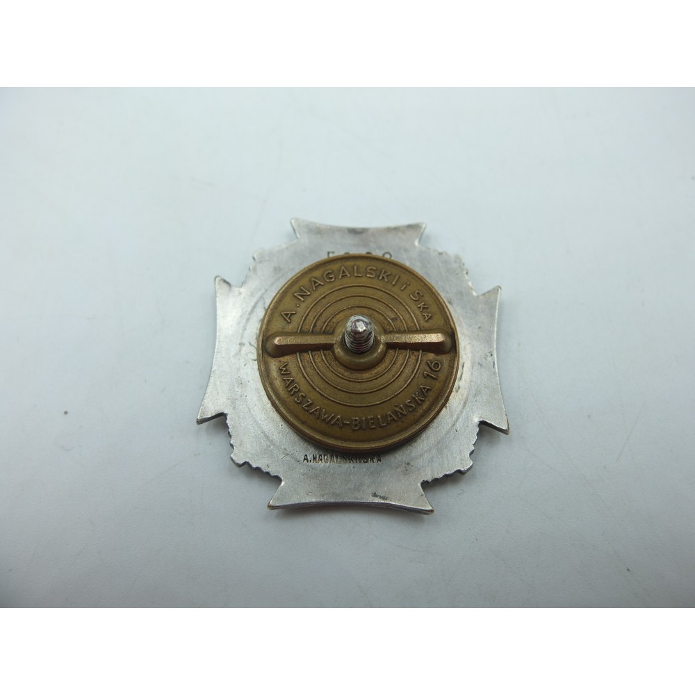 Odznaka pamiątkowa Wołyńskiej Szkoły Podchorążych Rezerwy Artylerii, Włodzimierz Wołyński, jednoczęściowa, w kształcie równoramiennego krzyża. W otoku inicjały S P R A, między ramionami krzyża promienie. na stronie odwrotnej numer 5393 i sygnatura wykonawcy A. NAGALSKI i SKA