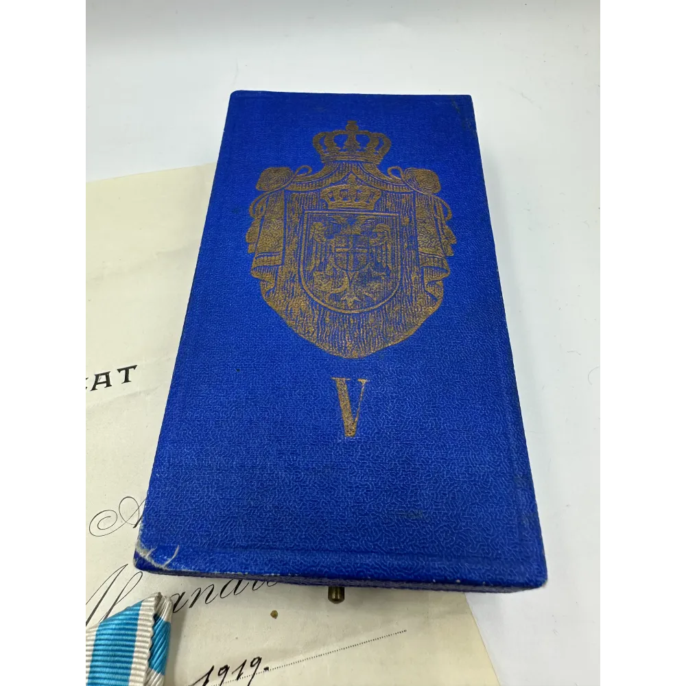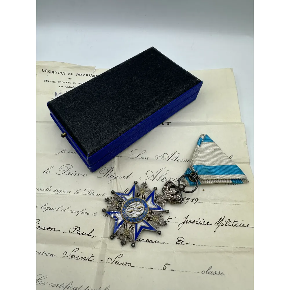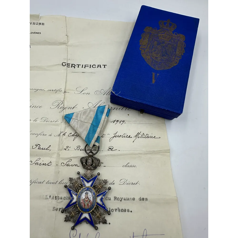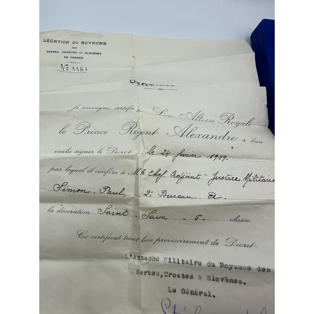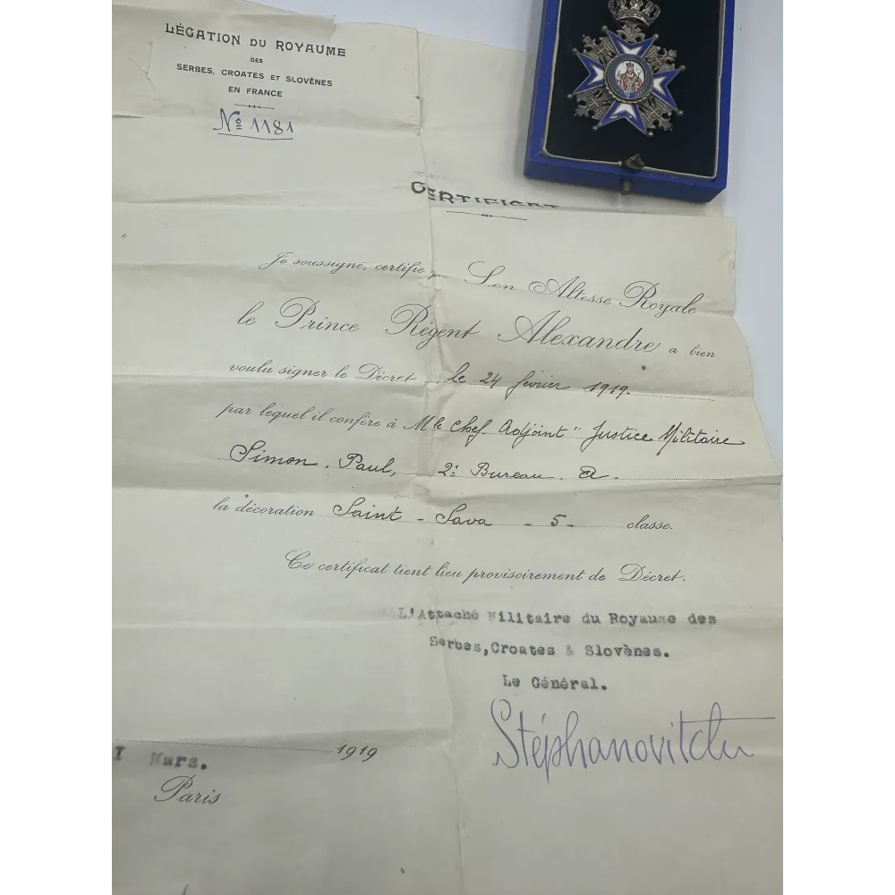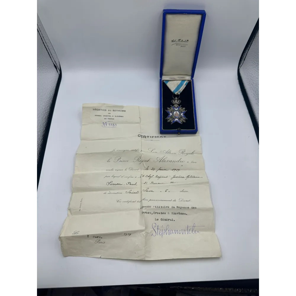 Order Świętego Sawy V klasa, produkcja francuzka Arthur Bertrand. Pudełko w dobrym stanie + rzadkie nadanie z 1919 , szefowi sądu wojskowego - Paul Simon