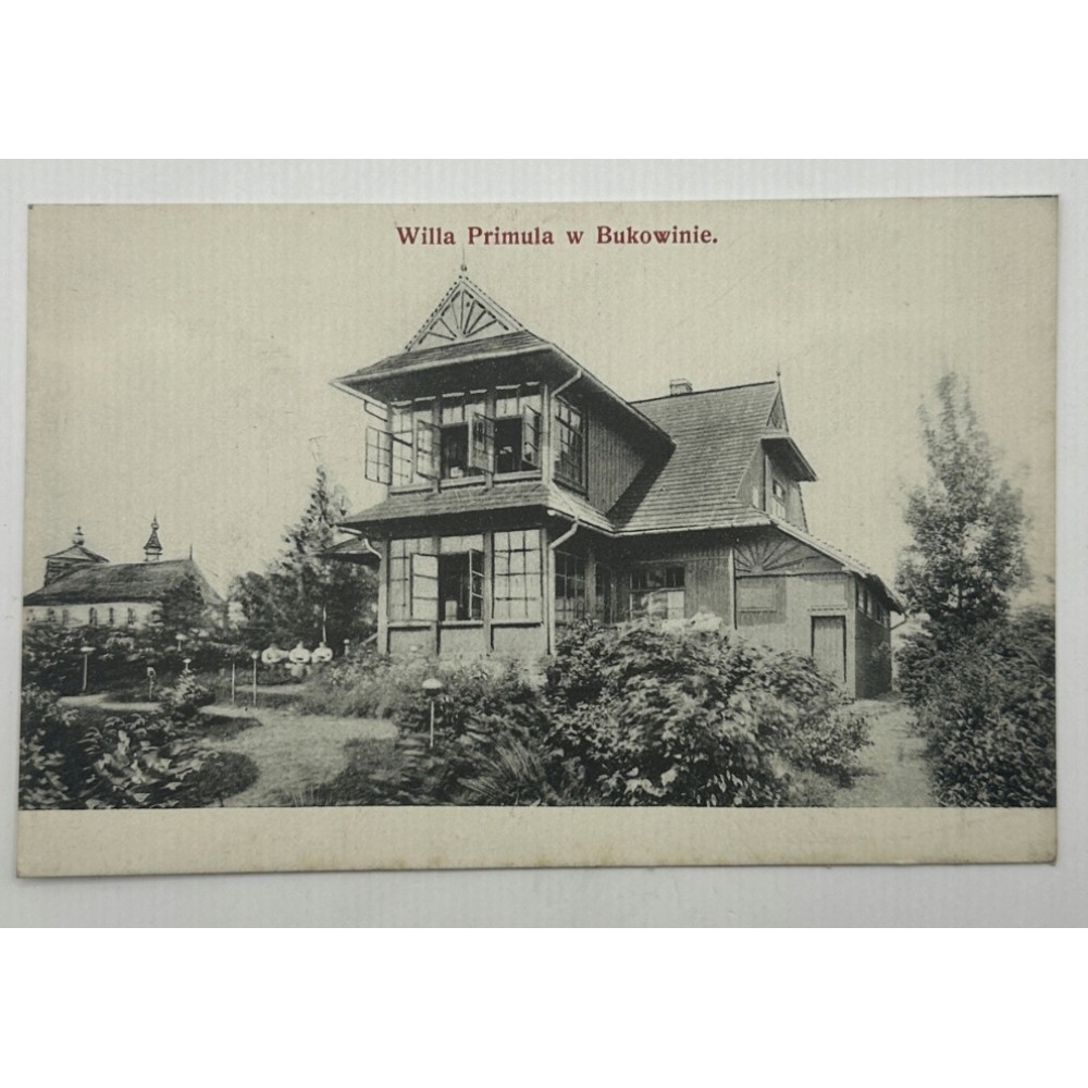 Pocztówka przedstawia Willę Primula, pierwszy dom letniskowy wybudowany w Bukowinie Tatrzańskiej, położony niedaleko kościoła parafialnego.